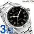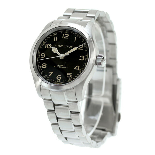 3年保証キャンペーン ハミルトン カーキ フィールド マーフ オート 38mm スイス製 メンズ レディース 腕時計 H70405130 HAMILTON KHAKI FIELD Murph Auto アナログ ブラック 黒 ◆HAMILTON(ハミルトン)はアメリカ発祥の老舗ブランドです。創業翌年に誕生した懐中時計「ブロードウェイ・リミテッド」は、他の時計よりも正確に時を刻むことから鉄道用時計として採用されました。その後も航空用時計や軍用時計として採用されるなど、品質の高さと流行にながされない独自のデザインが世界中の人々に支持されています。 映画ファンにはアイコニックな存在の元祖「マーフウォッチ」が、モダンなアレンジを加えて登場。ブラックダイヤルに配された「カーキ フィールド マーフ」の数字はやや膨らみを持ち、視認性が向上。また、カテドラル針がビンテージルックを添えます。ハミルトン愛好家にも、ハリウッドファンにも愛される38mmモデルが、サテン仕上げの3連メタルブレスレットで登場です。