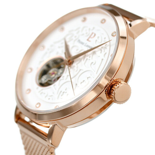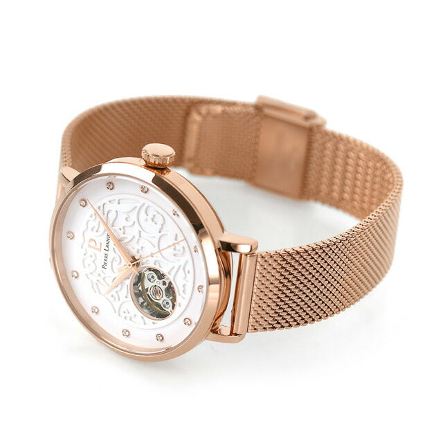正規品 ピエールラニエ エオリアオートマウォッチ オープンハート フランス製 自動巻き レディース 腕時計 P310F908 Pierre Lannier EOLIA アナログ ホワイト ピンクゴールド 白 ◆ピエール・ラニエ社は、1977年にフランス、ストラスブルグ市近郊に創設されました。「常に時代の最先端を駆けるファッション性の高い時計作り」をコンセプトに、多くのファンを魅了しています。 女性のためにデザインされたオートマウォッチ。ピエールラニエで人気のエオリアコレクションのオートマタイプが登場です。機械的なオートマウォッチだけれどレディースモデルは女性らしさを文字盤のフラワーのカッティングで表現しています。これ1本つけるだけでその日のコーディネートをさりげなく格上げしてくれます。結婚式やパーティーなど華やかなシーンにはもちろん、スーツにも併せていただけます。 機械式腕時計
