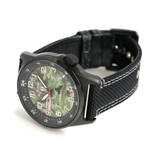 正規品 7年保証キャンペーン ケンテックス JSDF スタンダード 44mm 陸上自衛隊 日本製 クオーツ メンズ 腕時計 S715M-08 Kentex JSDF STANDARD 44mm アナログ カモフラージュ×ブラック ◆Kentex(ケンテックス)は1989年に創業し、1994年にケンテックス・ジャパンを設立して本格始動しました。「高品質な時計を、適正な価格で」をブランドコンセプトに掲げています。創業以来、時計外装の技術とデザイン力を培ってきており、日本のクラフツマンシップでディテールにこだわり抜き、機能と美を融合させた価値ある時計を造っています。 防衛省の協力のもとで企画・製作されているJSDFシリーズ。陸上自衛隊が正式採用する、迷彩を採用したモデル。文字盤には陸上自衛隊およびレンジャー部隊の正規マーク、ロゴやレンジャー徽章をデザイン。裏蓋にはT-4 (練習機) をデザイン。細部にまでこだわったデザインが特徴です。ベルトには軽量で通気性に優れ頑強なバリスティックナイロンを採用しています。