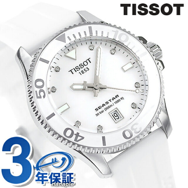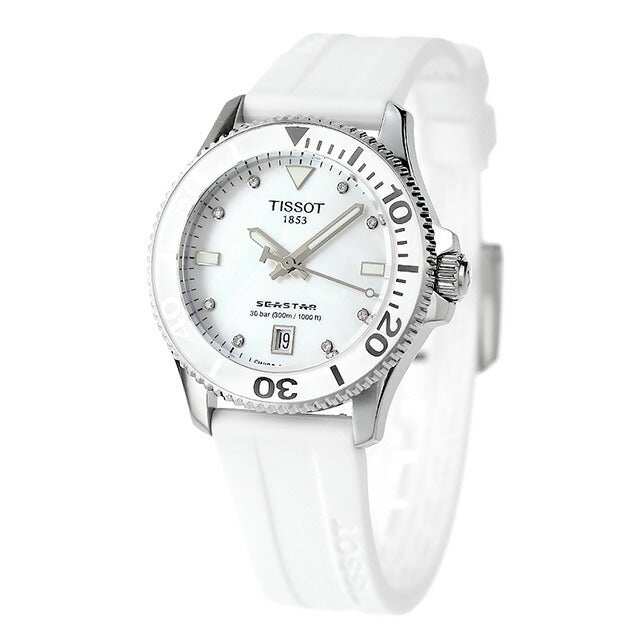 3年保証キャンペーン ティソ T-スポーツ シースター 1000 ダイヤモンド スイス製 メンズ 腕時計 T120.210.17.116.00 TISSOT T-SPORT SEASTAR 1000 アナログ ホワイトシェル ホワイト 白 ◆ティソ(TISSOT)は、創業160年を超える老舗の時計ブランドです。自社のロゴに、スイスの国旗“+”を掲げることを許された数少ないブランドの一つでもあります。世界160カ国に発信される時計は、高い機能性と美しいデザイン、そして特別な素材を組み合わせ、高い精度と明快なスタイルを兼ね備えています。 シックで主張があり、多用途に使用可能。316Lステンレススティール製ケースとブレスレット、ミネラルガラス製インサート付き逆回転防止ベゼル、ねじ込み式リューズ、30気圧(300m/1000ft)までの防水性などが装備されています。マリンスポーツはもちろん、シティスタイルに溶け込むエレガントなデザインを融合させた時計です。