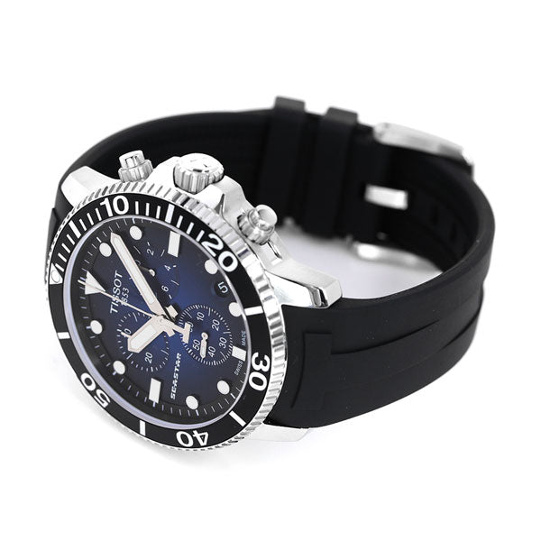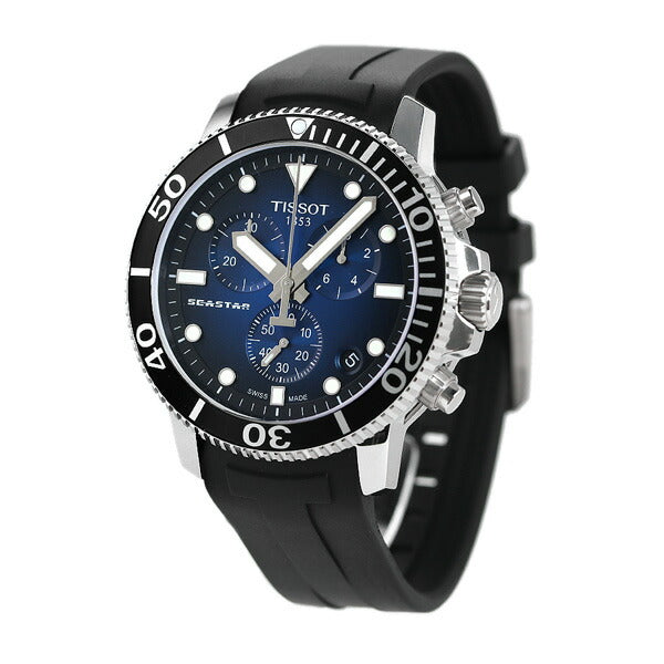 3年保証キャンペーン ティソ T-スポーツ シースター 1000 クロノグラフ 47.5mm スイス製 クオーツ メンズ 腕時計 T1204171704100 TISSOT T-SPORT SEASTAR 1000 CHRONOGRAPH アナログ ラウンド ブルーグラデーション×ブラック ◆ティソ(TISSOT)は、創業160年を超える老舗の時計ブランドです。自社のロゴに、スイスの国旗“+”を掲げることを許された数少ないブランドの一つでもあります。世界160カ国に発信される時計は、高い機能性と美しいデザイン、そして特別な素材を組み合わせ、高い精度と明快なスタイルを兼ね備えています。 高い防水性を実現し、シティスタイルに溶け込むエレガントなデザインを融合したトータルバランスに優れたダイバーズウォッチ。300mの防水性能を実現し、重厚な存在感を放ちながらも、逆回転防止ベゼルにアルミニウムを採用することで対傷性能の強化と軽量化を実現しています。電池切れ警告機能付きのムーブメントがバディとしての信頼感を高め、3つのカウンターを備えたダイアルが勇ましさを象徴するアイテムです。