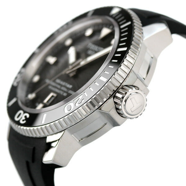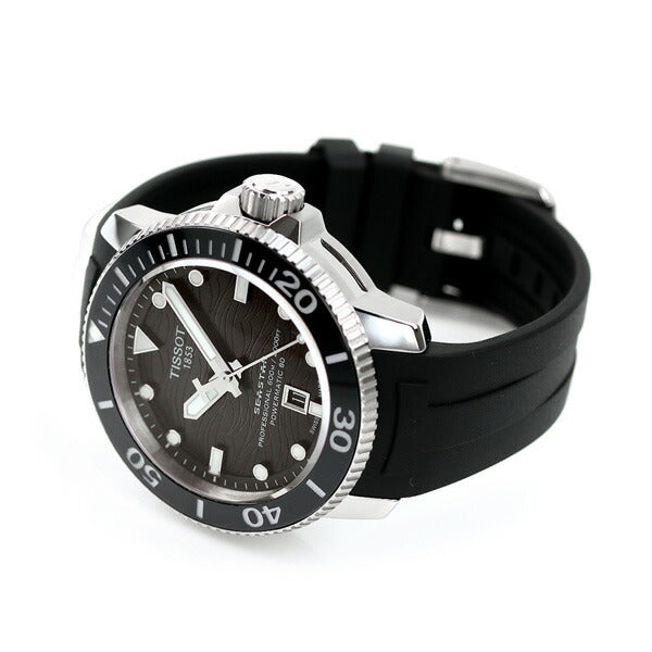 3年保証キャンペーン ティソ T-スポーツ シースター 2000 プロフェッショナル 46mm スイス製 自動巻き メンズ 腕時計 T120.607.17.441.00 TISSOT T-SPORT SEASTAR 2000 PROFESSIONAL アナログ グレー×ブラック ◆プロダイバーに求められる高い機能性とクオリティを標準装備し、TISSOTのダイバーズウォッチの新たな系譜を築いたTissot Seastar 2000 Professional。素材を贅沢に用い、ステンレススチール自体がもつ強さを活かした堅牢かつ耐衝撃性に優れた仕上がりに加えて、ダイバーズウォッチに欠かせない逆回転防止ベゼルは、濡れた手やグローブをしていてもしっかりとグリップするように設計されているなど、細部にまで徹底したつくりになっています。また、深海での過酷な条件下で長時間作業することを余儀なくされるプロダイバーのために水深100m以上の飽和潜水に対応するべく、9時位置にヘリウムエスケープバルブを搭載。波の模様が刻まれたダイアルはまるでは深海へと潜水していくかのごとく外周に向かって深みを帯びていくグラデーションを描きます。 機械式腕時計