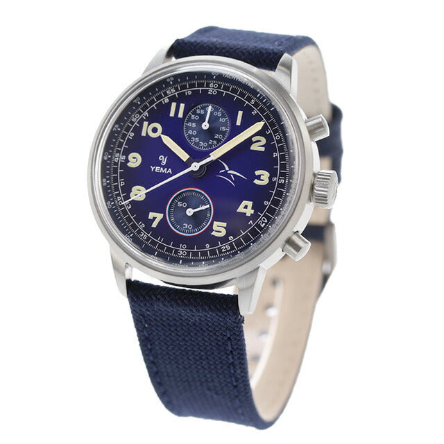 正規品 イエマ フライグラフ バイコンパックス フレンチ エアフォース クロノグラフ フランス製 メンズ 腕時計 YMHF1582AA-GG YEMA FLYGRAF BI-COMPAX FRENCH AIR FORCE アナログ ブルー ネイビー ◆YEMA(イエマ)は、1948年以来のフランスの歴史的なブランドです。YEMAワークショップは、スイス国境沿いのジュラ山塊のオードゥーにあり、フランスの小さな町モルトーを拠点としています。歴史的および地理的要素により、フランスの時計製造会社YEMAは独自の「メゾン」機械式ムーブメントを設計することができました。 フランス空軍との共同開発により設計・開発されたこのモデルには、セイコーのVK61ハイブリッドキャリバーが搭載されており、垂直バイコンパックス クロノグラフと、文字盤に刻印されたフランス空軍のロゴとラウンデルが特徴です。12時位置のサブ レジスターにはクロノグラフの60分タイマーが保持され、6時位置のサブ レジスターは小秒針として機能します。
