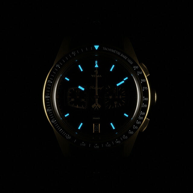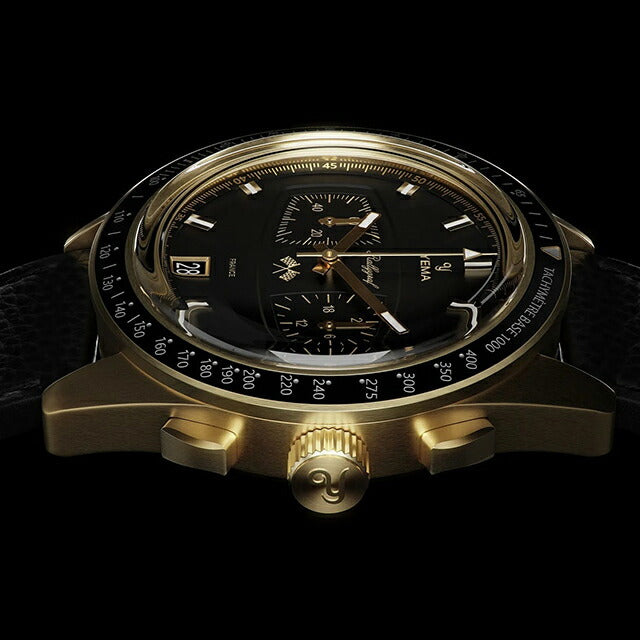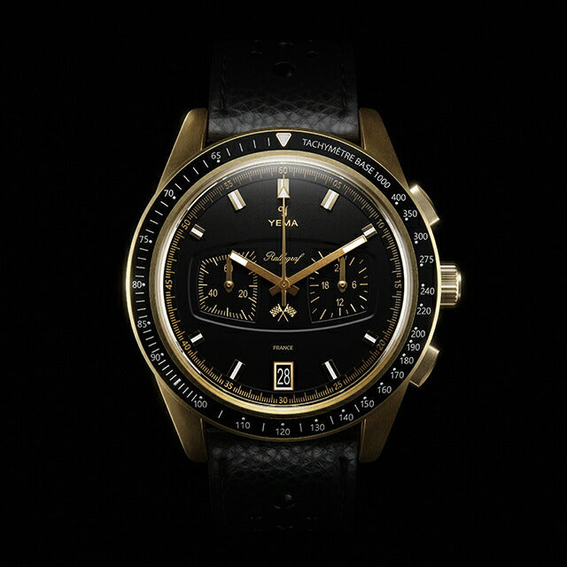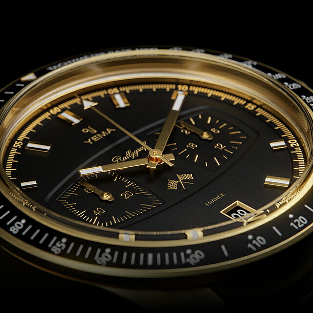 正規品 イエマ ラリーグラフ メカクォーツ II クラシック レーシング スクール クロノグラフ フランス製 メンズ 腕時計 YMHF1585-AA YEMA Rallygraf Meca-Quartz II Classic Racing School アナログ マットブラック ブラック 黒 ◆YEMA(イエマ)は、1948年以来のフランスの歴史的なブランドです。YEMAワークショップは、スイス国境沿いのジュラ山塊のオードゥーにあり、フランスの小さな町モルトーを拠点としています。歴史的および地理的要素により、フランスの時計製造会社YEMAは独自の「メゾン」機械式ムーブメントを設計することができました。 このブラックとゴールドの特別版は、クラシック レーシング スクールと提携して、1970年代と 1980年代のフォーミュラ 1 ロータス チームのシングル シーターを彷彿とさせるデザインです。完全に再設計された PVDブロンズのスチールケース、ブロックプッシャー、ビンテージレースカーのダッシュボードを彷彿とさせる文字盤が特徴です。日付、時間、クロノグラフ機能は、セイコーの VK64ハイブリッドキャリバーによって駆動されます。