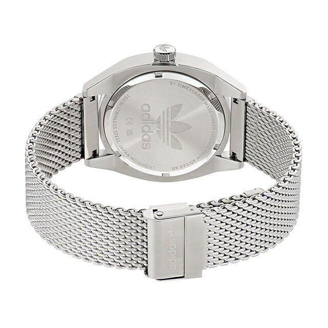 アディダス メンズ 腕時計 AOFH22502 adidas EDITION TWO アナログ ブラック 黒 ◆スポーツ用品メーカーとしても知られる有名なブランドadidasより2001年、ストリートスポーツウエアブランド「adidas Originals (アディダス オリジナルス)」がスタート。1972年から1996年までadidas社のカンパニーロゴだったトレフォイルロゴ(三つ葉のロゴ)をシンボルマークとし、アスリートのために開発された復刻商品から、現在のトレンドを反映させた新作モデルやコラボレーション商品まで、幅広いアイテムを展開しています。 さまざまなシーンで着用できる洗練されたデザインに信頼性のある日本製クォーツムーブメントを組み合わせたエディション ツー。 アディダス オリジナルスのDNAをふんだんに取り入れたモデルです。程よい重厚感のあるステンレス製のメッシュバンドに、急な雨やアウトドアなど幅広いシーンに対応する100m防水を備えています。誕生日や記念日などのプレゼントにもおすすめです。