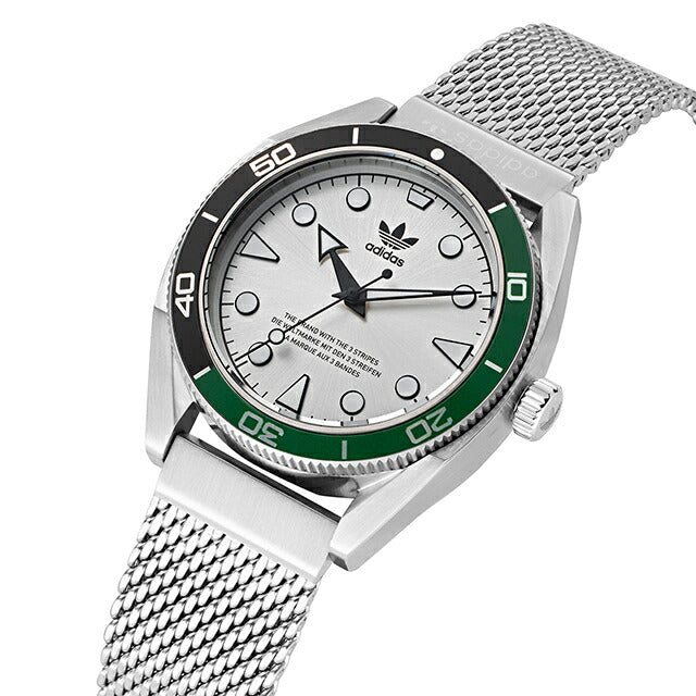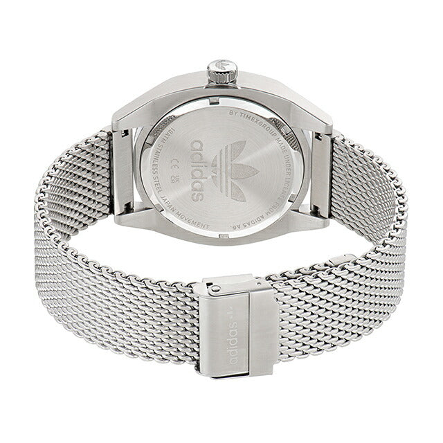 アディダス メンズ 腕時計 AOFH22503 adidas EDITION TWO アナログ シルバー ◆スポーツ用品メーカーとしても知られる有名なブランドadidasより2001年、ストリートスポーツウエアブランド「adidas Originals (アディダス オリジナルス)」がスタート。1972年から1996年までadidas社のカンパニーロゴだったトレフォイルロゴ(三つ葉のロゴ)をシンボルマークとし、アスリートのために開発された復刻商品から、現在のトレンドを反映させた新作モデルやコラボレーション商品まで、幅広いアイテムを展開しています。 さまざまなシーンで着用できる洗練されたデザインに信頼性のある日本製クォーツムーブメントを組み合わせたエディション ツー。 アディダス オリジナルスのDNAをふんだんに取り入れたモデルです。程よい重厚感のあるステンレス製のメッシュバンドに、急な雨やアウトドアなど幅広いシーンに対応する100m防水を備えています。誕生日や記念日などのプレゼントにもおすすめです。