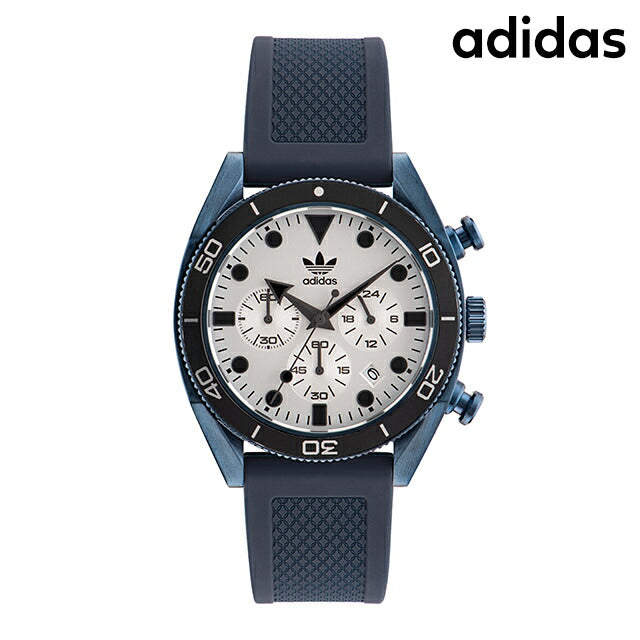 アディダス クロノグラフ メンズ 腕時計 AOFH23004 adidas Edition Two Chrono 多針アナログ ホワイト ブルー 白 ◆スポーツ用品メーカーとしても知られる有名なブランドadidasより2001年、ストリートスポーツウエアブランド「adidas Originals (アディダス オリジナルス)」がスタート。1972年から1996年までadidas社のカンパニーロゴだったトレフォイルロゴ(三つ葉のロゴ)をシンボルマークとし、アスリートのために開発された復刻商品から、現在のトレンドを反映させた新作モデルやコラボレーション商品まで、幅広いアイテムを展開しています。 クロノグラフ搭載のモデル。スポーティなデザインでアクティブなシーンでも活躍します。