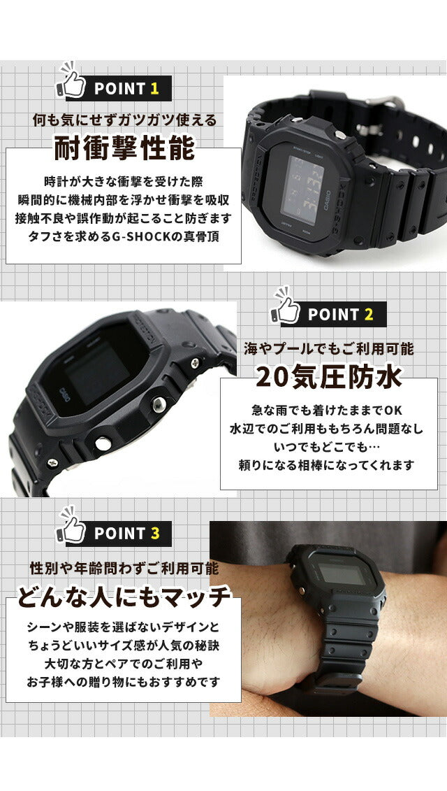 7年保証キャンペーン CASIO G-SHOCK G-ショック ジーショック G-SHOCKの中でも特に人気の5600シリーズ 使いやすいデザインとちょうどいいサイズ感は性別や年齢問わず幅広い方に支持されています。男性はもちろん女性の方、お子さまでもご利用が可能です。20気圧防水も備え、海やプールでももちろんOK! 耐衝撃機能で何も気にせずガツガツ使えるのもポイント。一本持っていて損はしない!大切な方への贈り物にも間違いない!当店バイヤーがおすすめするG-SHOCK人気モデルです。