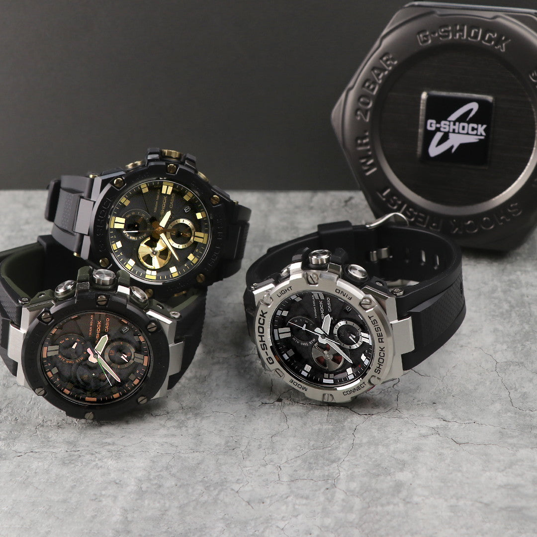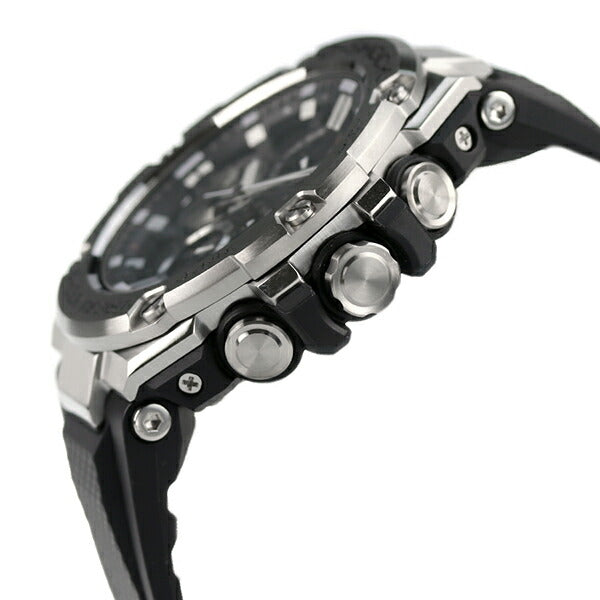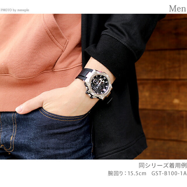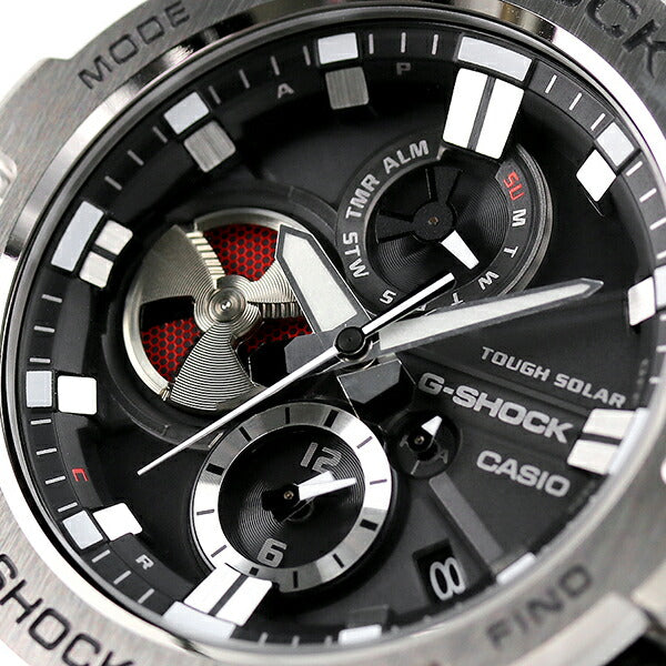 7年保証キャンペーン カシオ Gショック 海外モデル Gスチール モバイルリンク Bluetooth クロノグラフ ソーラー メンズ 腕時計 GST-B100-1AER CASIO G-SHOCK G-STEEL アナログ ブラック ◆タフネスを追求し進化を続けるG-SHOCKから、アナログ表示によるクロノグラフを搭載したモデルが登場。全てのインダイアルに耐衝撃構造を備えたアナログ表示を実現。9時位置に配置したアイコンとなるディスク針には、デュアルコイルモーターを採用し、針の動きや機能美を追求。ジェット機エンジンの重厚なブレードをモチーフにデザインを施し、ディスク針を動かす面白さと、文字板の組み合わせによるG-SHOCKならではのデザインに仕上げ、まさにタフな「クロノグラフ」を完成させました。また、高密度実装技術によるモジュールの小型・薄型化を可能とし、14.1mmを実現。装着性や時計としてのクオリティを高めました。更に、いかなる世界の環境下でも正確な時刻表示をさせる事を追求し、Bluetooth通信機能を搭載。ソリッドなケースとウレタンバンド採用し、耐衝撃構造とメタルの質感を両立したモデルです。 国内モデル品番:GST-B100-1AJF