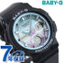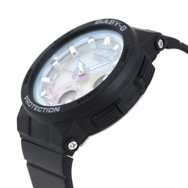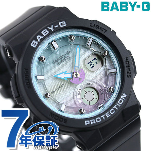 7年保証キャンペーン カシオ ベビーG ビーチ・トラベラー・シリーズ ワールドタイム クオーツ レディース 腕時計 BGA-250-1A2DR CASIO Baby-G Beach Traveler Series アナデジ グラデーション×ブラック ◆ビーチをテーマにした「Beach Traveler Series(ビーチ・トラベラー・シリーズ)」から、輝く貝殻をモチーフにしたモデルの登場です。今回は、太陽の光を反射して美しく輝く、貝殻のグラデーションカラーをコンセプトにしたモデル。メタリックな質感の文字盤に爽やかなカラーをグラデーションで施し、インデックスも光を反射してキラキラと煌くデザインに。また、文字盤見切り部分にはスケルトン素材を採用し、海の水面を表現。時分針には錨のモチーフをデザインし、ビーチアクティビティにぴったりのモチーフを散りばめました。内蔵のブラックライトに反応してフェイスが発光するネオンイルミネーターを搭載し、ライトを点灯すると時分針がピンクや緑に光り幻想的な夜の海を連想させます。 国内モデル品番:BGA-250-1A2JF