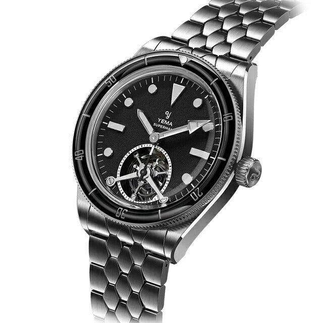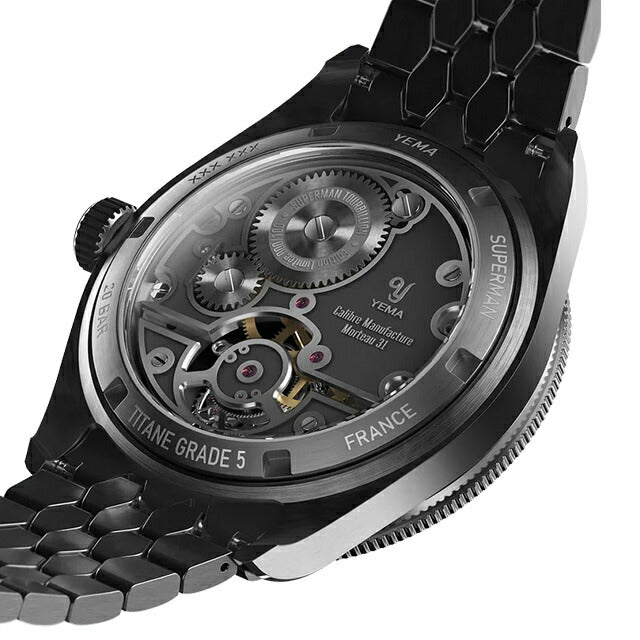 正規品 イエマ スーパーマン・トゥールビヨンCMM.31 リミテッドエディション チタン 数量限定 オープンハート フランス製 メンズ 腕時計 12.25.31.66.TE.MT YEMA SUPERMAN アナログ ブラック 黒 ◆YEMA(イエマ)は、1948年以来のフランスの歴史的なブランドです。YEMAワークショップは、スイス国境沿いのジュラ山塊のオードゥーにあり、フランスの小さな町モルトーを拠点としています。歴史的および地理的要素により、フランスの時計製造会社YEMAは独自の「メゾン」機械式ムーブメントを設計することができました。 スーパーマン・トゥールビヨンCMM.31の発表はイエマのミレジム・エディションの新たな時代の幕開けを意味します。これは私達の最高峰の時計製造ノウハウと自社開発技術を示す年間限定シリーズです。グレード5チタニウムから設計されたケースとブレスレットは、強度、軽量性、快適性の完璧なバランスを実現。文字盤は1960年代のスーパーマン伝説モデルの美的デザインから着想を得ています。グレイン仕上げのブラックカラー文字盤にアプライド式のインデックス、そしてグレードA BWG9スーパールミノバを豊富に塗布されたポリッシュ仕上げのステンレススティール製の針を特徴とします。直径43mm、厚さわずか11.7mmというサイズ(この複雑機構にしては驚異のスリムサイズ)に、バランスの取れた22mmのラグ幅を備えたこのタイムピースは、優雅さと均整の美を体現しています。 機械式腕時計