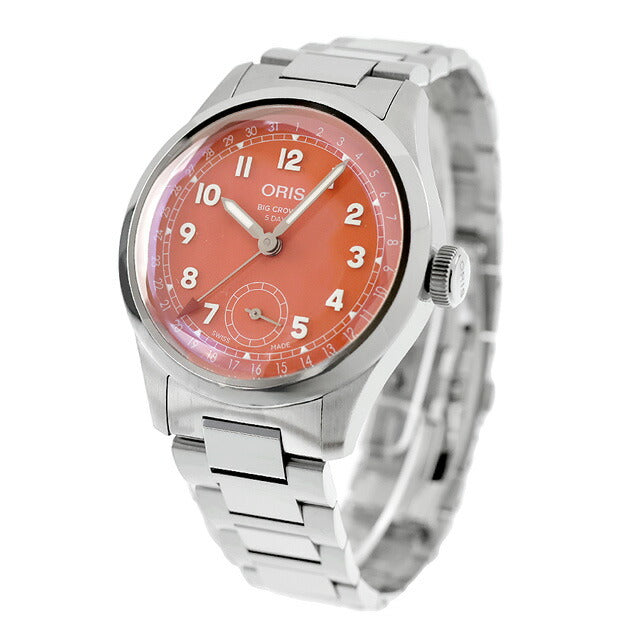 正規品 7年保証キャンペーン オリス ビッククラウン ポインターデイト スイス製 メンズ 腕時計 01 403 7799 4068-07 8 20 06 ORIS Big Crown Pointer Date アナログ レッド 赤 ◆ORIS(オリス)は、ポール・カッティン氏とジョージ・クリスチャン氏の2人によってスイスのヘルシュタインで創設されました。近くを流れる小川にちなんで社名をオリスと命名。手頃な価格ながら、革新的で高機能かつ実用的な機能を備えた本格機械式時計で知られ、世界中の時計ファンから愛されているブランドです。 オリスと航空を結びつけたビッククラウンは、1938年誕生以来パイロットウォッチの原型になったコレクション。Calibre 403を搭載。テラコッタダイヤル、美しく人間工学に基づいたメタルブレスレットを組み合わせました。現代を生きるグローバルな人々のための様々なライフスタイルに寄り添うモデルです。 機械式腕時計