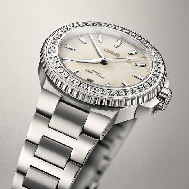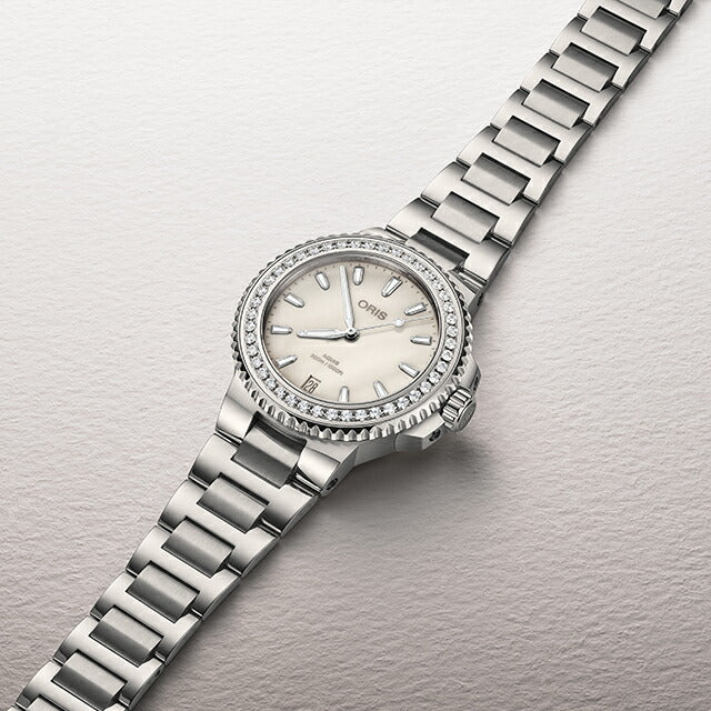 正規品 7年保証キャンペーン オリス アクイスデイト ダイヤモンド 36.5mm ダイヤモンド スイス製 メンズ レディース 腕時計 01 733 7792 4956-07 8 19 05P ORIS AQUIS DATE DIAMONDS アナログ ホワイトシェル 白 ◆ORIS(オリス)は、ポール・カッティン氏とジョージ・クリスチャン氏の2人によってスイスのヘルシュタインで創設されました。近くを流れる小川にちなんで社名をオリスと命名。手頃な価格ながら、革新的で高機能かつ実用的な機能を備えた本格機械式時計で知られ、世界中の時計ファンから愛されているブランドです。 アクイス デイト ダイヤモンド 36.5mmは、30気圧(300m)防水を誇る高性能ダイバーズ・ウォッチ。クリーム色のマザー・オブ・パールを使用した文字盤とベゼルにセットされたラボグロウンダイヤモンドで、エレガントさを演出。ベゼルに44個のブリリアントカットダイヤモンドがセットされています。 機械式腕時計