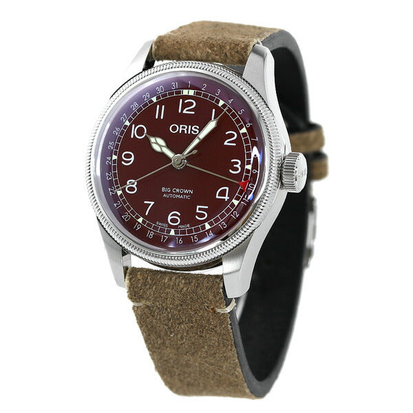 正規品 7年保証キャンペーン オリス ビッグクラウン ポインターデイト 40mm スイス製 自動巻き メンズ 腕時計 754-7741-4068LBR ORIS BIG CROWN アナログ レッド×ブラウン ◆ORIS(オリス)は、ポール・カッティン氏とジョージ・クリスチャン氏の2人によってスイスのヘルシュタインで創設されました。近くを流れる小川にちなんで社名をオリスと命名。手頃な価格ながら、革新的で高機能かつ実用的な機能を備えた本格機械式時計で知られ、世界中の時計ファンから愛されているブランドです。 オリスと航空を結びつけたビッククラウンは、1938年誕生以来パイロットウォッチの原型になったコレクション。時代を超越したオリジナルモデルへの忠実なオマージュです。パイロットがグローブを着けたまま操作できる大型リューズ(クラウン)とセンター針で日付を示す特殊なコンプリケーションを備えた、先駆的な時計です。カジュアルスタイルにはもちろん、クラシックな大人の装いにも味わいを添えてくれます。 機械式腕時計