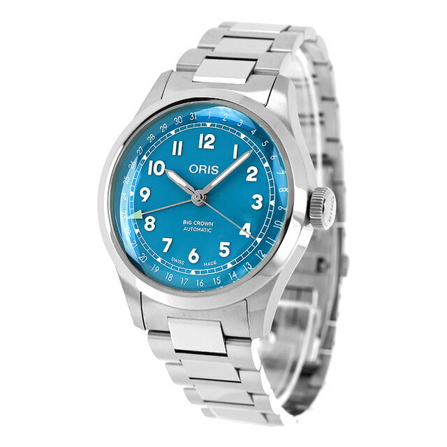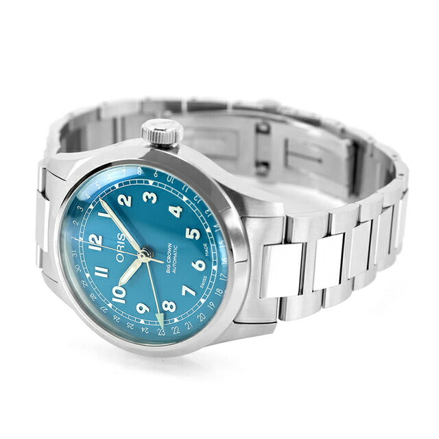 正規品 7年保証キャンペーン オリス ビッククラウン ポインターデイト 40mm スイス製 メンズ 腕時計 01 754 7798 4065-07 8 20 06 ORIS Big Crown Pointer Date アナログ ブルー ◆ORIS(オリス)は、ポール・カッティン氏とジョージ・クリスチャン氏の2人によってスイスのヘルシュタインで創設されました。近くを流れる小川にちなんで社名をオリスと命名。手頃な価格ながら、革新的で高機能かつ実用的な機能を備えた本格機械式時計で知られ、世界中の時計ファンから愛されているブランドです。 オリスと航空を結びつけたビッククラウンは、1938年誕生以来パイロットウォッチの原型になったコレクション。時代を超越したオリジナルモデルへの忠実なオマージュです。鮮やかなターコイズブルーが美しいダイヤル、ステンレススチールケース、Hリンクブレスレットを採用。クラシックな大人の装いに味わいを添えてくれます。 機械式腕時計