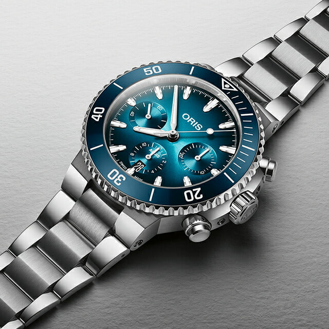 正規品 7年保証キャンペーン オリス アクイス クロノグラフ 43.5mm クロノグラフ スイス製 メンズ 腕時計 01 771 7793 4155-07 8 23 01PEB ORIS AQUIS CHRONOGRAPH アナログ ブルーグラデーション ◆新生アクイスデイトコレクションに、クロノグラフが加わりました。細部に人間工学的なこだわりをもって、見た目の美しさと機能を両立させる工夫を凝らしています。ケースとベゼルはスリムなシェープに整え、ブレスレットにテーパーをかけています。文字盤にも細部の改善を加えて、以前より視認性を高めました。ガード付ねじ込み式リューズ、セラミックインサートの逆回転防止ベゼル、蓄光インデックス、300m防水を確保しながらも裏蓋がシースルークリスタルガラスであることなど、高性能ツールウォッチであるアクイスの主要スペックは以前と変わりありません。中身はスイス製自動巻のオリス キャリバー771です。エレガントなサンレイ加工を施したブルーの文字盤は水中でも太陽光を反射して美しく輝きます。モダンで汎用性の高い、全天候型であらゆるシーンに対応する機械式腕時計です。 発売日:2024年8月発売 機械式腕時計