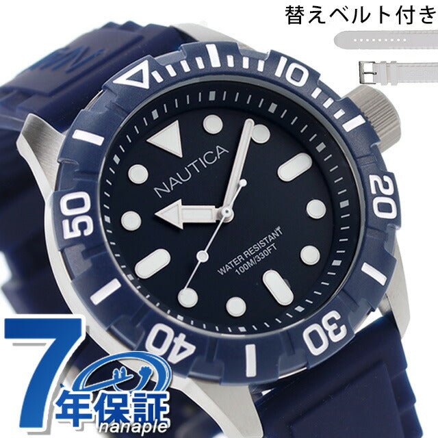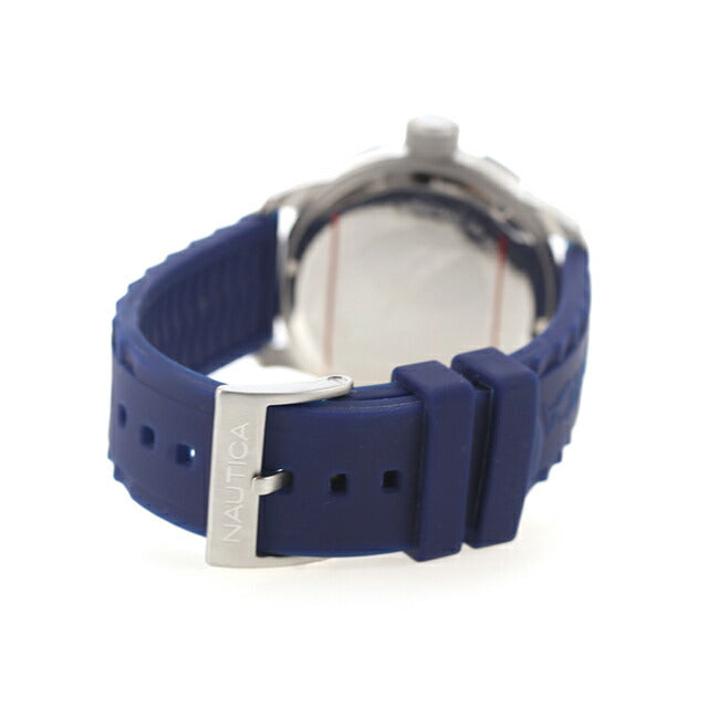 正規品 7年保証キャンペーン ノーティカ NSR100 ジェリー セット クオーツ メンズ 腕時計 A11601G NAUTICA NSR100 JELLY SET アナログ ネイビー ◆ノーティカは1983年にニューヨークで誕生したアメリカンライフスタイルブランドです。メンズ、レディース、キッズのウェアをはじめ、ファッショングッズやアクセサリー、ホームファブリックにいたるまで、ファミリーで親しめるアイテムを幅広くラインナップ。モダンで洗練されたマリンスタイリングを得意とし、その魅力をあますことなく表現したノーティカウォッチは、世界最大級の時計会社グループによる革新的な最先端技術がもたらす高品質・高性能を併せ持っています。 本格派のダイバーズウォッチのデザインをベースに、ビタミンカラーを取り入れたカジュアルなスポーツモデル。ねじ込み式リューズとケースバックを備えた100m防水の本格スペックに、替えベルトとバンド交換用工具付き。スタイルに併せて付け替え、お使いいただけます。アクティブシーンにおすすめです。