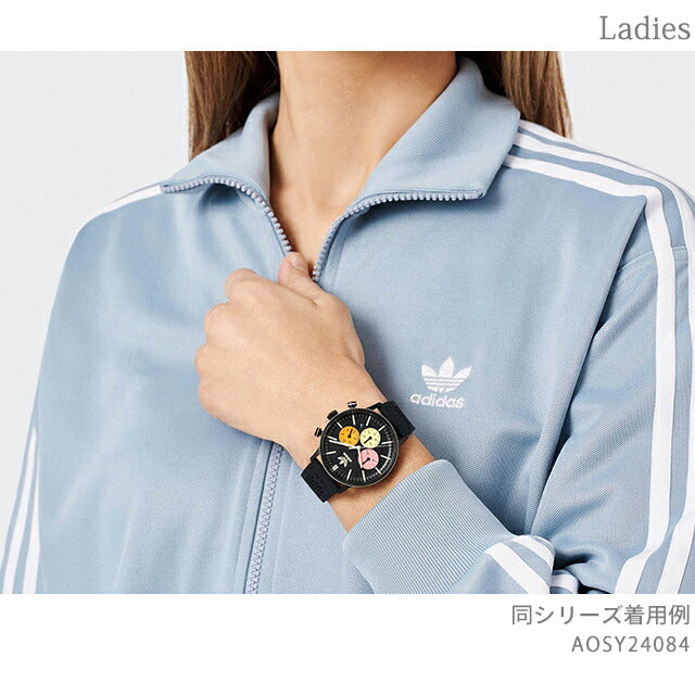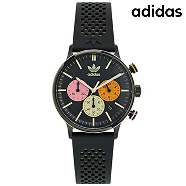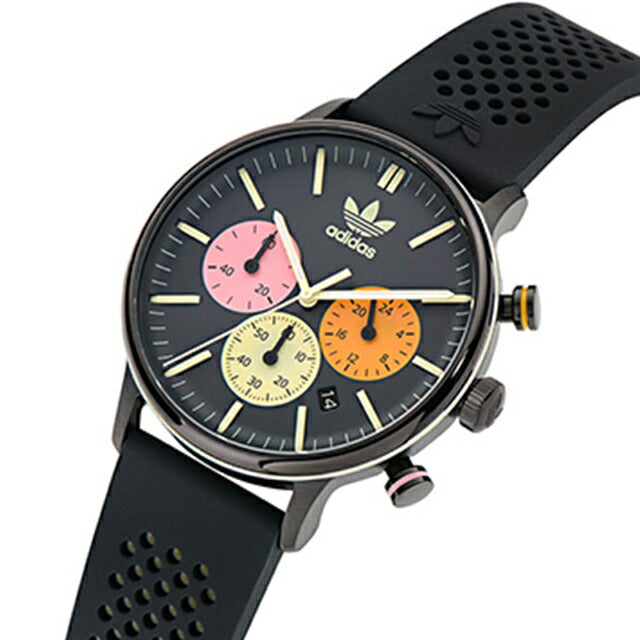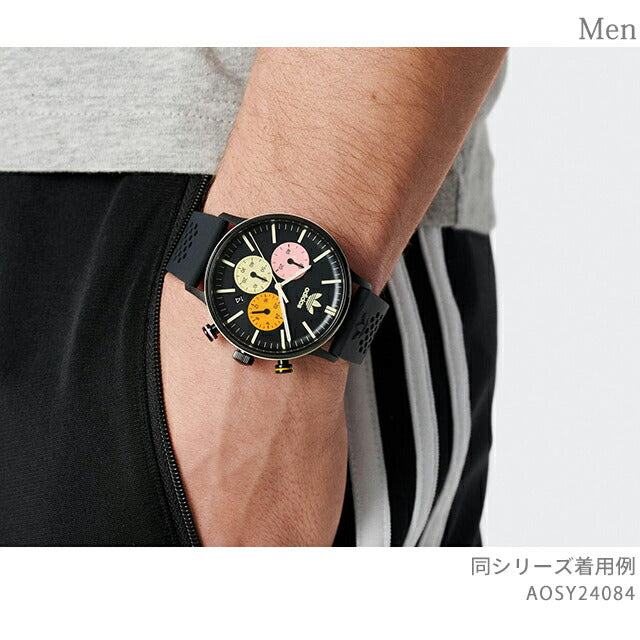 アディダス クロノグラフ メンズ レディース 腕時計 AOSY24084 adidas CODE ONE CHRONO アナログ ブラック 黒 ◆スポーツ用品メーカーとしても知られる有名なブランドadidasより2001年、ストリートスポーツウエアブランド「adidas Originals (アディダス オリジナルス)」がスタート。1972年から1996年までadidas社のカンパニーロゴだったトレフォイルロゴ(三つ葉のロゴ)をシンボルマークとし、アスリートのために開発された復刻商品から、現在のトレンドを反映させた新作モデルやコラボレーション商品まで、幅広いアイテムを展開しています。 スポーティでエレガンスなデザインに、時間を計測できるクロノグラフ機能を備えたコード ワン クロノ。ポップなカラーを散りばめたモデル。文字盤とベルトはシックなブラックになっています。