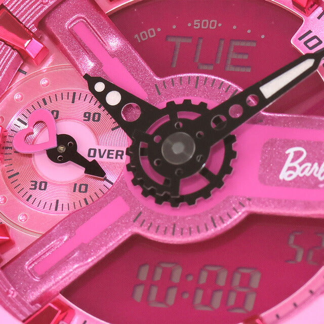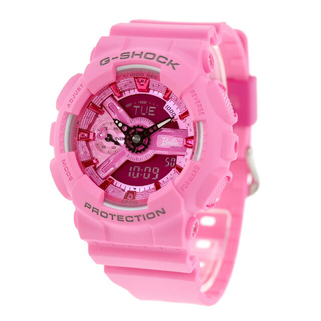 7年保証キャンペーン gショック ジーショック G-SHOCK バービー コラボレーションモデル アナログデジタル クォーツ 電池式 クォーツ 電池式 レディース 腕時計 GMA-S110BE-4ADR Barbie Collaboration Model ANALOG-DIGITAL WOMEN アナデジ ピンク ◆自分らしく生きる女性を応援するブランドとして1959年にデビューした「Barbie(バービー)」。バービーは現在も、自分らしさと明日の可能性を追い求める人々を力づけています。ベースモデルに、歯車状の細かなパーツを立体的に組み上げた文字板デザインが特徴のGMA-S110を採用。部位ごとにニュアンスを変えたワントーンピンクで、バービーの世界観を表現しました。9時位置にハートモチーフの小針、3時位置にはバービーロゴをレイアウトしています。バンドにバービーのシンボルマーク、遊環にバービーのロゴをあしらいました。裏蓋にもバービーのシンボルマークを刻印。さらに、オリジナルデザインのスペシャルパッケージは、バービードールの箱をイメージしており、バービーを取り出す際のワクワク感を楽しんでいただきたいと、思いを込めました。ベゼル、バンドなどの主な樹脂パーツに、環境負荷低減への貢献が期待されるバイオマスプラスチックを使用しています。 国内モデル品番:GMA-S110BE-4AJR