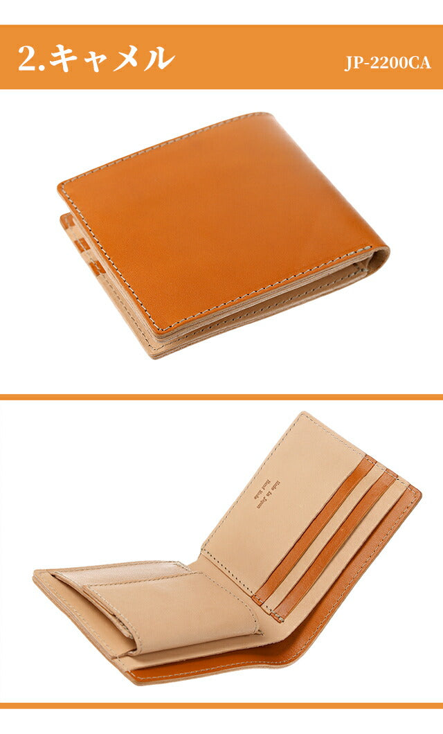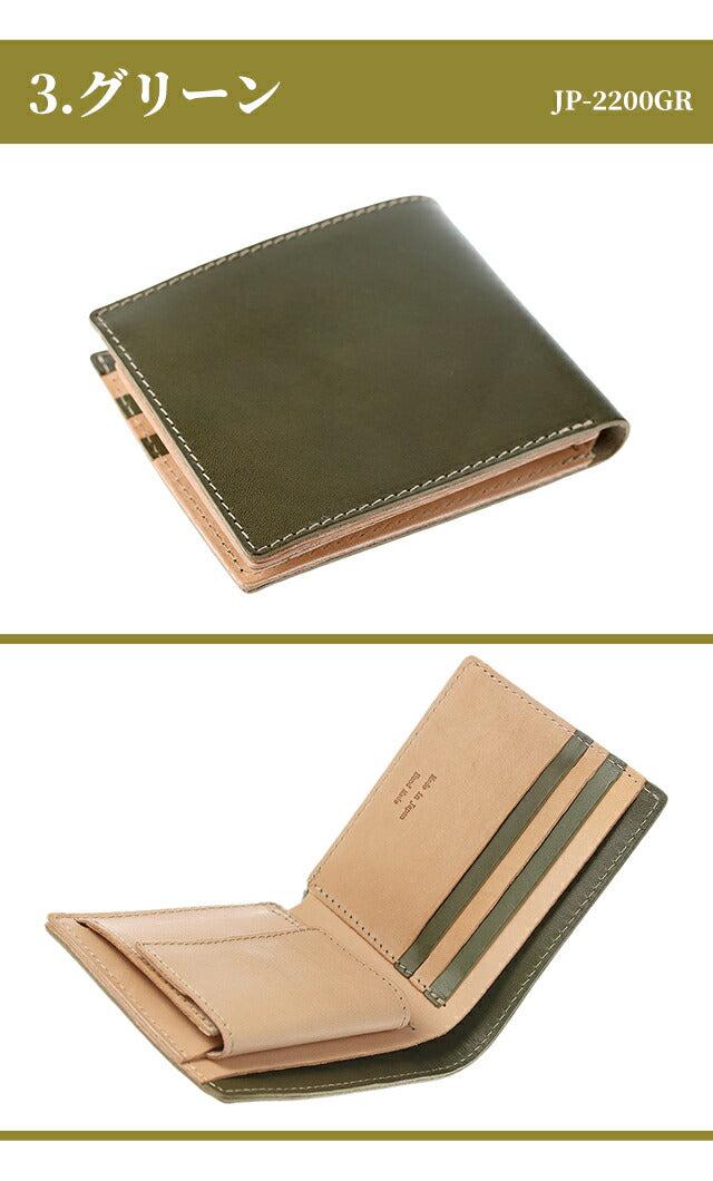 二つ折り財布 二つ折り財布 メンズ 革 レザーウォレット 小銭入れ 日本製 財布 ◆JAPANウォレットは全ての素材を国内最高級クラスの栃木レザーを巧みの技を持った職人によって一つ一つ丁寧に裁断、縫製しました。そのため大量生産が困難です。JAPANウォレットは中の素材にもこだわり、全て一枚皮の栃木レザーを使用しカード入れも数多くすることによって実用性・耐久性にも大変優れております。 大き目のお札いれなので出し入れしやすく角が折れにくい。たっぷり入る小銭入れで500円×10、100円×15、50円×10、10円×15(全て収納可能)。お洒落なバイカラーで耐久性を計算しギリギリまで薄く軽くしています。 【1】ブラック JP-2200BK 【2】キャメル JP-2200CA 【3】グリーン JP-2200GR
