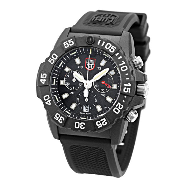 7年保証キャンペーン ルミノックス ネイビーシールズ クロノグラフ 3580 シリーズ 45mm スイス製 クオーツ メンズ 腕時計 l3581 LUMINOX NAVY SEAL CHRONOGRAPH 3580 SERIES アナログ ブラック×ホワイト ◆LUMINOX(ルミノックス)は1989年に創業。高性能なスポーツラインを展開しており、ラテン語で「明るい夜」を意味するブランド名を掲げているように、最先端の発光と視認性の良さを特徴としています。極限の状況下で行われるミッションで必要となる視認性を確保しているルミノックス時計は、特殊軍用時計として絶対的な信頼感を得ています。 3500シリーズデザインをベースに3080シリーズがリニューアル。文字盤のアラビアンインデックスをバーインデックスに変更することで、絶妙なデザインバランスに。文字盤には、ネイビーシールズのスローガンである「THE ONLY EASY DAY WAS YESTERDAY」が刻まれています。また、裏蓋をステンレスに変更し、堅牢性をアップ。ベルトも耐久性を高めるためにラバーに変更しました。