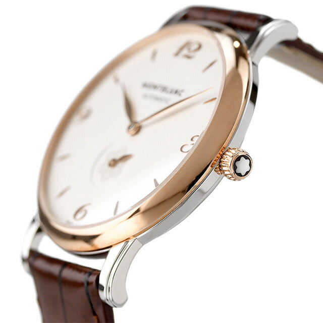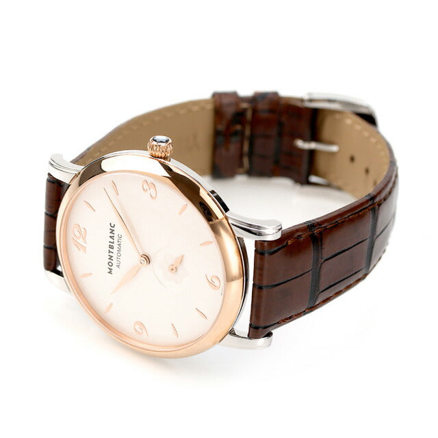 7年保証キャンペーン モンブラン スター レガシー クラシック スイス製 自動巻き メンズ 腕時計 107309 MONTBLANC STAR アナログ ホワイト ブラウン 白 革ベルト ◆1906年、筆記具を専門に取り扱うシンプロ・フィラーペン・カンパニーとして誕生し、高級万年筆の名品「モンブラン」を発表。後に、アルプス最高峰のモンブランの名前を取り入れ、社名を変更しています。1997年から時計製造を開始。ジュネーブで開催される有数の時計見本市、SIHH(国際高級時計展:ジュネーブサロン)に参加し、熟練の職人技による時計を発表。世界中のウォッチ&ジュエリー業界の大きな注目と称賛を浴びました。モンブランは、高品質と伝統的なクラフツマンシップを始めとする永続的価値を守り続けています。 スターレガシーは、伝統的なクラフツマンシップとモダンな技術が巧みに融合しています。クラシックな雰囲気の漂うモデル。シンプルかつ上品なデザインが特徴。誕生日や記念日などのプレゼントにもおすすめです。 機械式腕時計
