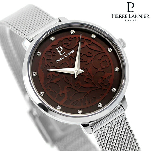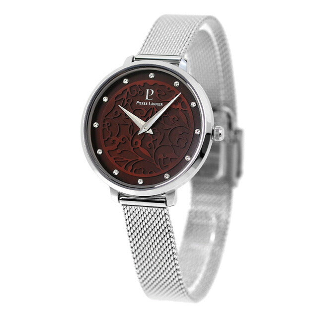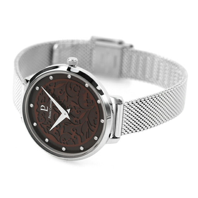 正規品 ピエールラニエ エオリア コレクション ショコラ フランス製 クオーツ レディース 腕時計 P429D674 Pierre Lannier eolia アナログ ブラウンシェル ◆ピエール・ラニエ社は、1977年にフランス、ストラスブルグ市近郊に創設されました。「常に時代の最先端を駆けるファッション性の高い時計作り」をコンセプトに、多くのファンを魅了しています。 レースのようなカッティングが目を惹く文字盤の「エオリア」。角度によってオーロラに輝くシェル文字盤は日本限定モデルです。インデックスにはさり気なく石をあしらいジュエリーのような煌き。何気ない日常に華を添える時計に仕上がっています。また、ベルト裏面のつまみのついたバネ棒をスライドさせるだけの操作でバンドの取り外し、取り付けが簡単に行えます。気分や服装にあわせてお手持ちのベルトと付け替え、お楽しみいただけます。手元を華やかに彩るデザインで、プレゼントにもおすすめです。