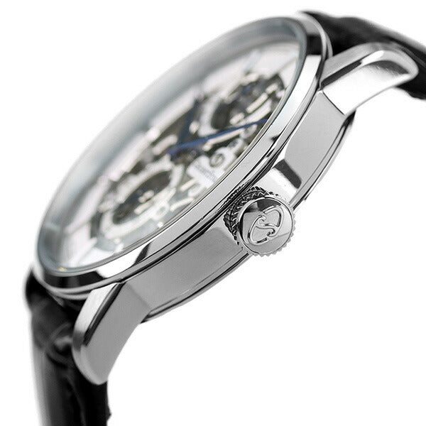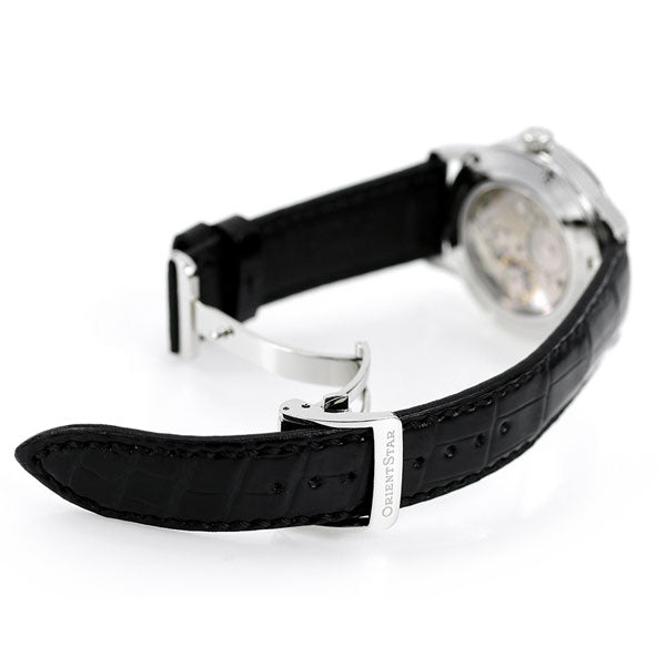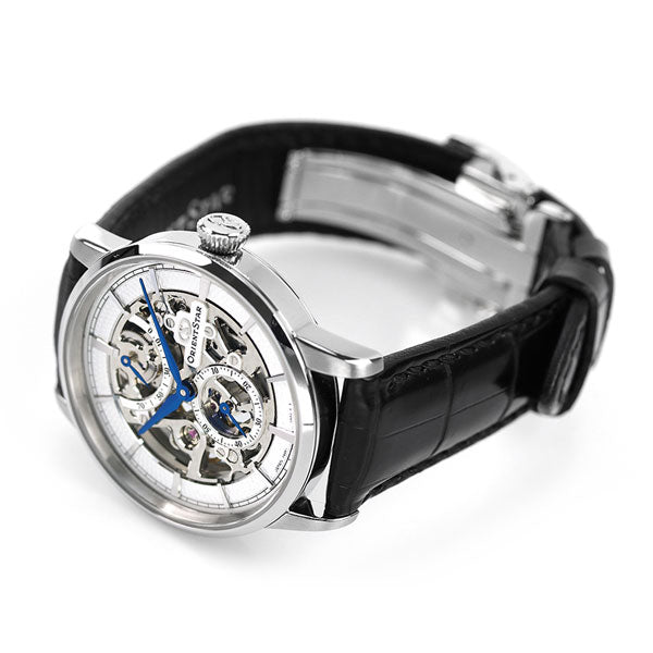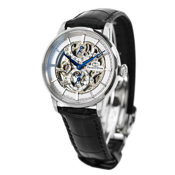 正規品 7年保証キャンペーン 送料無料 オリエントスター クラシック スケルトン 銀河 日本製 手巻き メンズ 腕時計 RK-AZ0002S ORIENT STAR CLASSIC SKELETON アナログ スケルトン×ブラック 革ベルト ◆スケルトンシリーズが生まれ変わって登場。「星は回り続ける」というORIENT STARのキーワードから、周回性のある「銀河(ぎんが)」をモチーフにしたムーブメントを採用し、新しいデザインにリニューアル。まるで銀河を凝縮したようなシルバーとブルーの美しいコントラストが特徴です。ムーブメントの縁には面取りを施し、渦目・波目模様の質感も大幅に向上。シリコン製がんぎ車搭載の新ムーブメント採用により、ORIENT STARでは初のパワーリザーブの70時間化を実現しました。文字板は極限までムーブメントを肉抜きすることで、スケルトンの美しさを表現しながら、日差+15秒~-5秒の高精度を実現。ガラスにはコーティングを施した両球面サファイアガラスを採用し、美しいダイアルの仕上げをお楽しみ頂けるデザインに仕上げました。 発売日:21年3月発売 機械式腕時計 Made in Japan