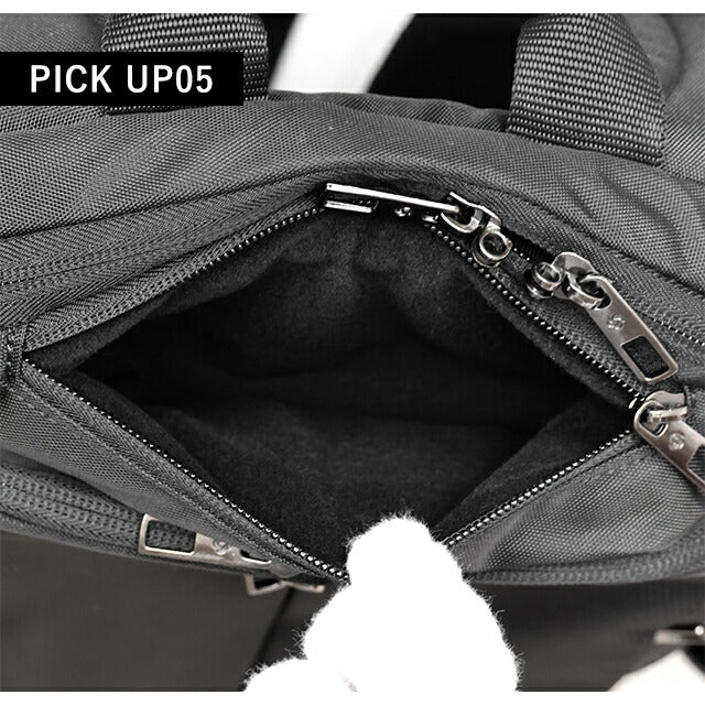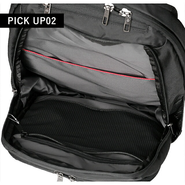 | 仕様 | 開閉:ダブルファスナー式 前面:ダブルファスナーポケット×1、ファスナーポケット×1、オープンポケット×6、ペン入れ×2 内部:ファスナーポケット×1、オープンポケット×1 側面:オープンポケット(ゴム付き)×左右各1 背面:ダブルファスナーポケット×1、ファスナーポケット×1、オープンポケット×1 キャリーバーループ |