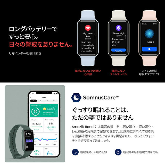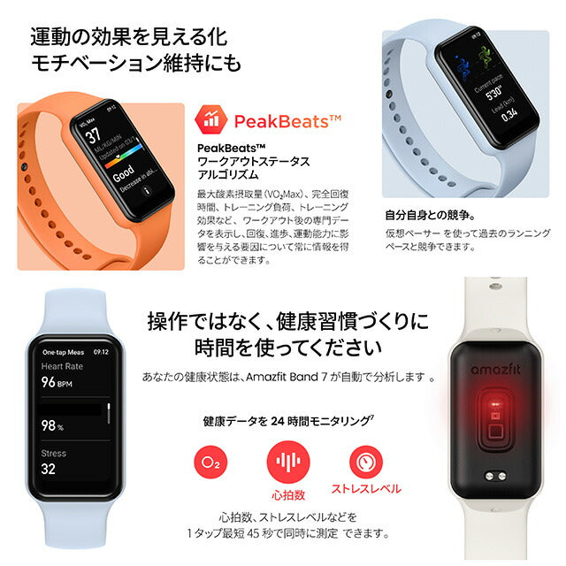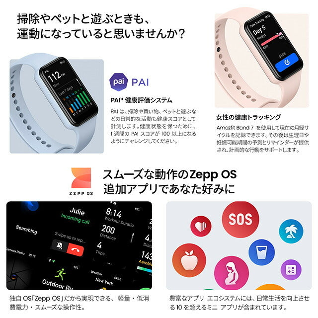 正規品 アマズフィット Band 7 Bluetooth 充電式クオーツ ユニセックス メンズ レディース スマートウォッチ SP170049-C01 Amazfit Band 7 デジタル ブラック 黒 ◆Amazfit(アマズフィット)は、2015年に設立、アメリカ・ドイツ・フランスなど世界90ヵ国以上で販売されているスマートウォッチブランドです。スポーツや健康に関する充実の機能をもつスマートハードウェアをリーズナブルに提供し、デイリーユースからアウトドアスポーツユースまで幅広いニーズに応えるブランドです。 数あるスマートバンドの中で、最高水準のロングバッテリーを実現。これまでの懸念だった画面の見にくさも、鮮明な大型ディスプレイで解決しています。Amazfit Band 7は、Amazon Alexaの日本語に対応しています。また、現在の月経サイクルを記録できるので、生理日や妊娠可能期間の予測と炉マインダーが提供され、計画的な活動をサポートします。男女問わずお使いいただけ、色違いで友達や家族ともお楽しみいただけます。 Xiaomi シャオミ
