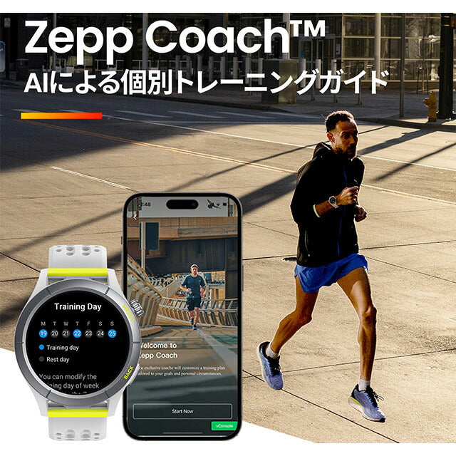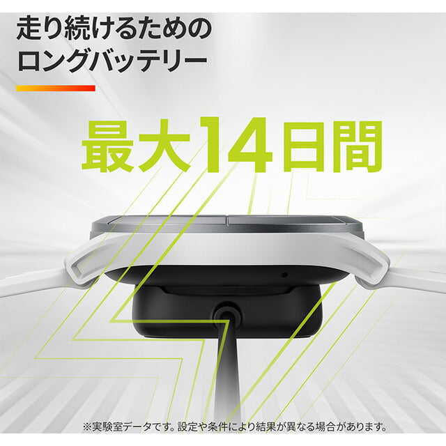 | 仕様 | 5ATM防水 解像度:454×454 タッチスクリーン:Panda強化ガラス、指紋防止コーティング センサー 健康:BioTrackerTMPPG生体センサー(血中酸素レベル対応) 運動:加速度センサー、ジャイロセンサー、地磁気センサー、気圧センサー(気圧高度 計)、環境光センサー ポジショニング:円偏波+デュアルバンド(L1+L5) 6衛星測位システム(GPS、GLONASS、Galileo、BeiDou、QZSS、NavIC) 接続:Bluetooth5.3 バッテリー容量(定格値):440mAh(最大7日~45日) 理論充電時間/充電方式:約2時間/マグネット充電 対応デバイス:Android7.0以上、iOS12.0以上 アプリ:Zeppアプリ |