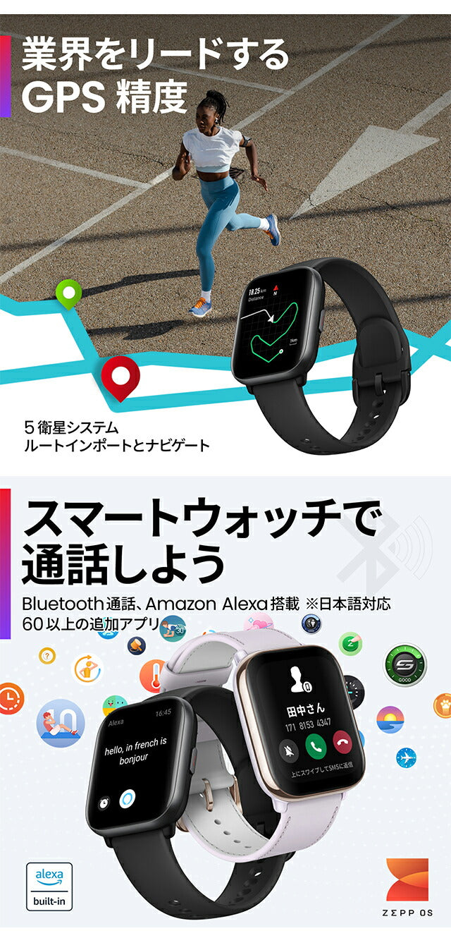スポーツ機能:120種以上のワークアウトモード、7種のワークアウト自動認識、Zeppコーチ(フィットネス) 筋トレスマート認識、PeakBeatsTM、VO2 Max、バーチャルペーサー、ライブブロードキャスト インターバルトレーニング、ナビゲーション、ワークアウト状態など