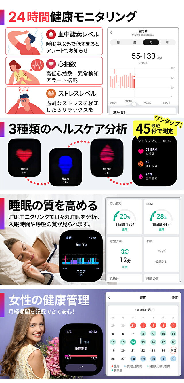 ヘルスケア機能:レディネス、各種モニタリング(心拍数・ストレス・睡眠・血中酸素レベル)、睡眠スケジュール、月経管理 呼吸エクササイズ、PAI、異常警告、アクティビティ計測(歩数・消費カロリー・移動距離・座りすぎ警告) 週間レポート、ワンタップ計測など