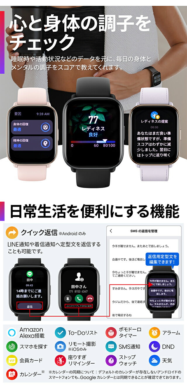 スマートアシスタント:各種アプリ通知、クイック返信、天気予報、スケジュール、カレンダー、音声メモ、スマートフォンを探す To-Doリスト、ポモドーロタイマー、リモート撮影、Alexa、会員カード、モーニングアップデートなど