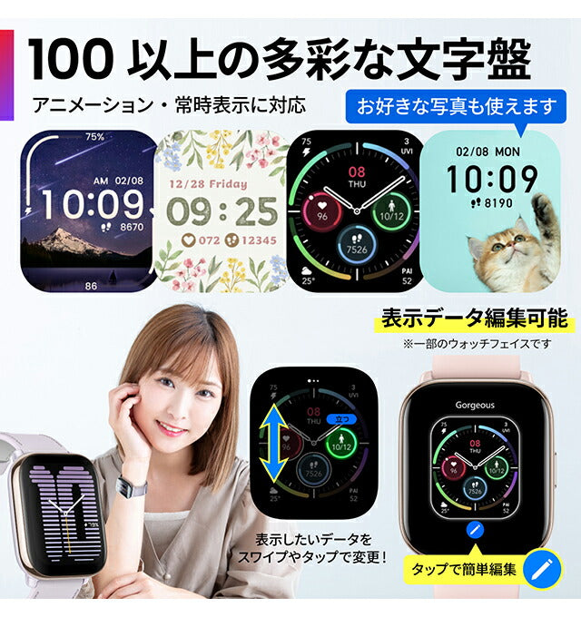 時計機能:アラーム、タイマー、ストップウォッチ、世界時計、ウォッチフェイス変更(100以上)など