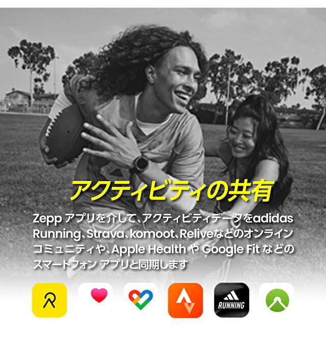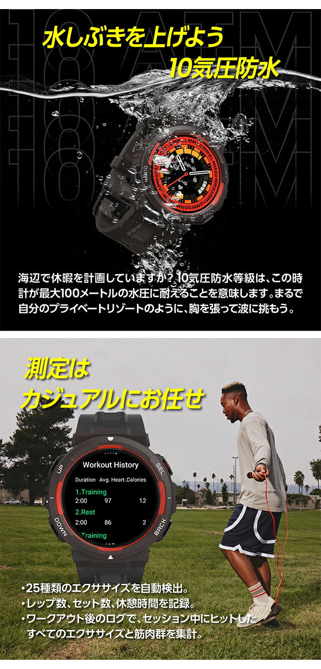スポーツ機能:130種以上のワークアウトモード、7種のワークアウト自動認識、Zeppコーチ(フィットネス)、筋トレスマート認識、PeakBeatsTM、VO2 Max、バーチャルペーサー、ライブブロードキャスト、インターバルトレーニング、ナビゲーション、ワークアウト状態など