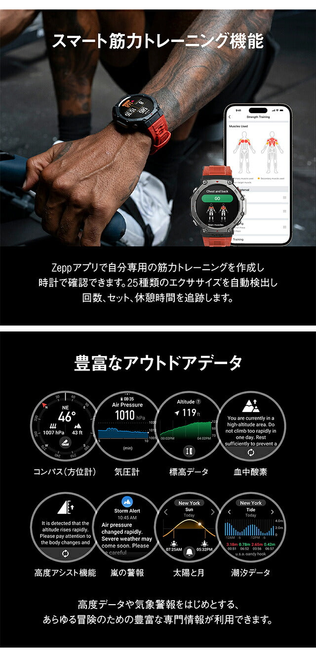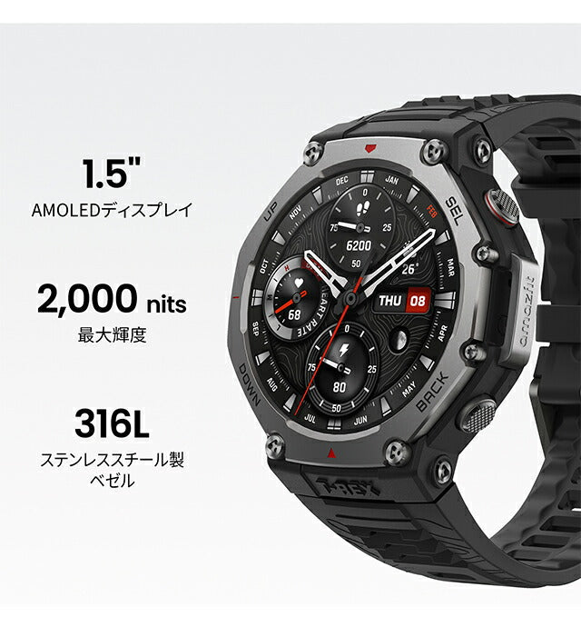 正規品 アマズフィット T-Rex ラバ RD メンズ スマートウォッチ SP170069-C221 Amazfit デジタル シルバー グレー ◆頑丈な耐久性と多彩な機能を兼ね備えたAmazfitT-Rex3は、日常的に運動を楽しみ、情熱的な冒険を求める方のために設計されています。1.5インチAMOLEDディスプレイは、2,000nitの高輝度で視認性に優れています。ナイトディスプレイをオンにすると、データが明るい赤、緑、またはオレンジ色で表示されます。極限の暑さ、寒さ、湿度、衝撃などに耐えるよう設計されています。ミリタリーグレードのフレームとステンレススチール製のベゼルは、あらゆる局面に対応します。通常の使用で最大3週間以上、GPSモードで最大100時間以上使用可能で、より長くあなたの冒険を支えます。170以上のスポーツモードを搭載しています。 Xiaomi シャオミ