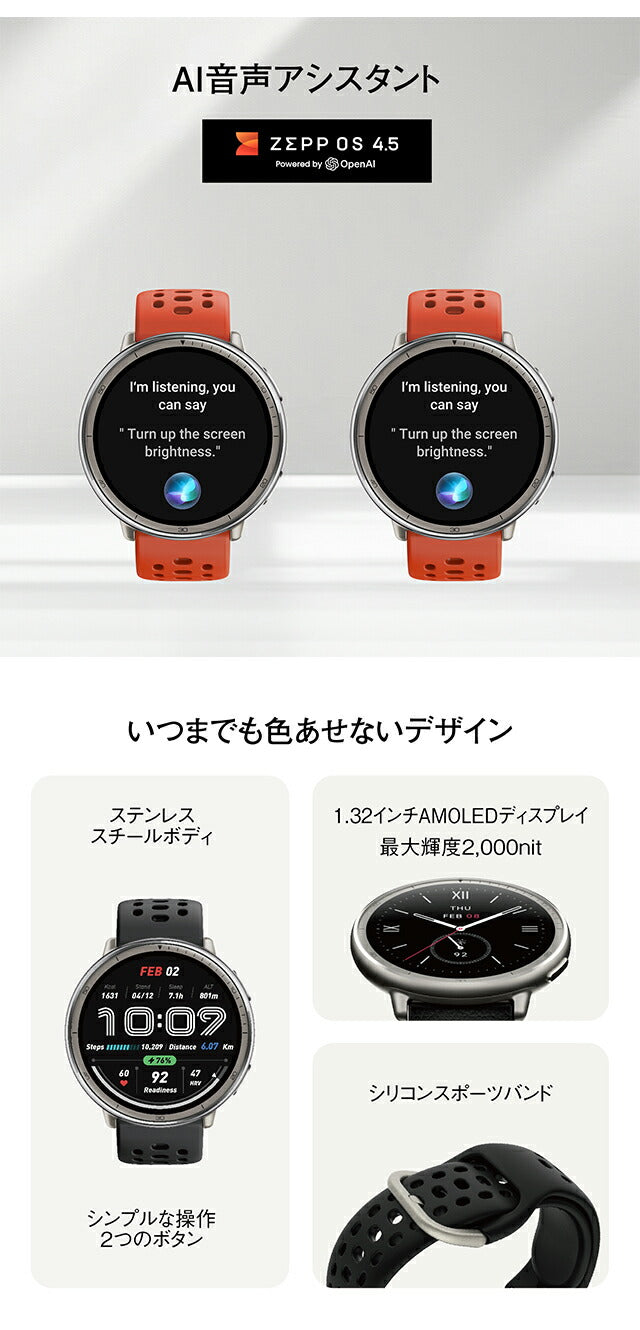 | 仕様 | 日常生活用防水(5気圧) 【ディスプレイ】 素材:HD AMOLED サイズ:1.32インチ 解像度:466×466 PPI:353 【バッテリー】 駆動期間:最大10日間(標準使用) 容量:270 mAh(標準値) 充電方法:マグネット式充電 充電時間:約2時間 【スポーツ機能】 スポーツモード:160+ スマート認識:8つのスポーツ フィットネスアプリとの同期:adidas Running、Strava、Komoot、Relive、Google Fit、Apple Health 【ヘルス機能】 24時間モニタリング:心拍数/血中酸素レベル/ストレスレベル 睡眠の質のモニタリング:睡眠段階(REMを含む) 昼寝の時間/睡眠スケジュール/睡眠時の呼吸の質/睡眠スコア 生理周期トラッキング:有 【センサー】 運動:加速度センサー、ジャイロスコープ、温度センサー、環境光センサー、地磁気センサー、気圧高度計 接続:Bluetooth 5.2 BLE 【その他】 ミニアプリ:対応※一部日本語非対応 アプリ:Zeppアプリ 対応デバイス:Android 7.0 以上、iOS 14.0 以上 |