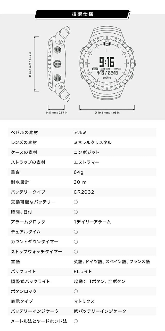 | 付属品 | SUUNTOオリジナルボックス ※取扱説明書につきましては、メーカー公式ページよりご確認ください。 |