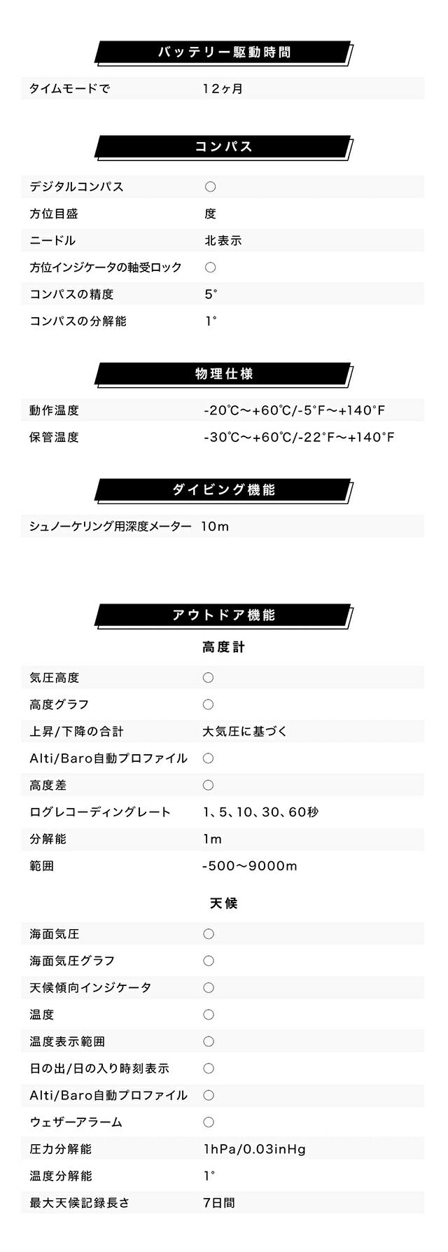| 仕様 | 30m防水 時間、日付 アラームクロック:1 デイリーアラーム デュアルタイム カウントダウンタイマー ストップウォッチタイマー 言語:英語、ドイツ語、スペイン語、フランス語 バックライト:EL ライト ボタンロック ディスプレイタイプ:マトリクス 駆動期間:12ヶ月(タイムモードで) デジタルコンパス 高度計 天候傾向インジケータ シュノーケリング用深度メーター:10m |