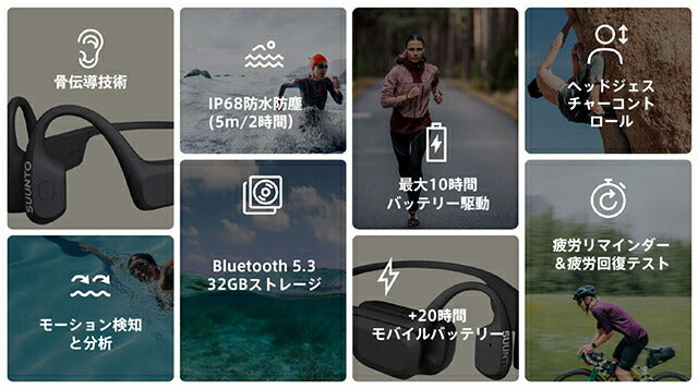 | 仕様 | 防水性能 IP68(5m/2h) 動作時間 最大約10時間 スントアプリ 対応 Bluetooth 5.3 通信距離 約10m ストレージ 32GB 【水泳向けの機能】 ・泳ぎの姿勢の確認 ・頭のピッチ角度の計測 ・呼吸の回数と角度 ・潜行時間 頸部疲労測定 首の可動性確認 ジャンプテスト評価 お好みのサウンドモードに変更可能 ストレージモード、Bluetoothモードを簡単に切り替え 通話の管理 音楽と音量のコントロール 電話に出る/電話を切る 音楽の再生/一時停止 曲送り 曲戻し 音量の調整 |