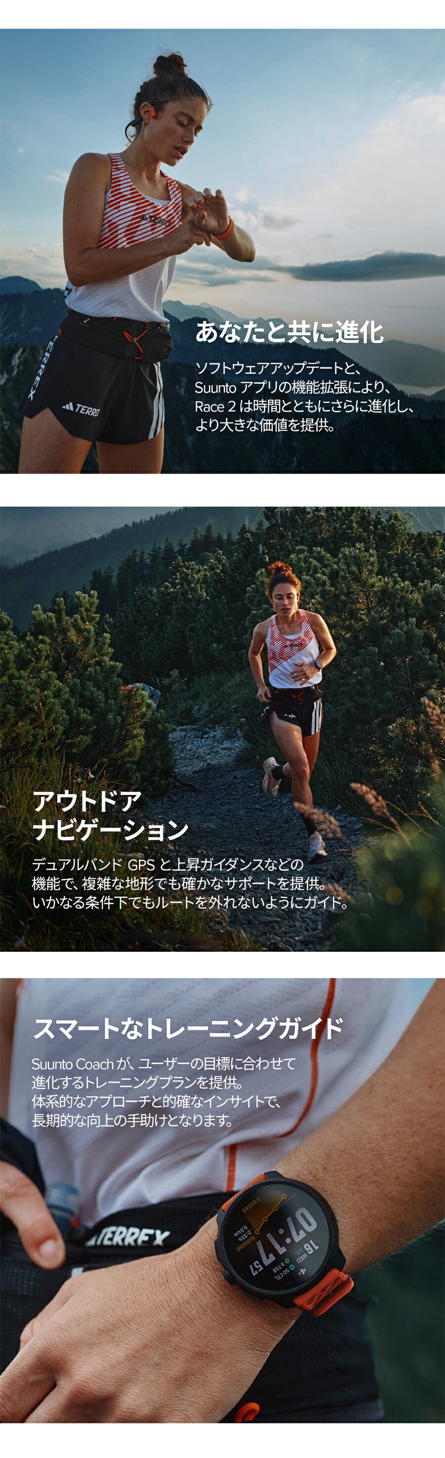 正規品 健康 スント レース 2 チタニウム チタン メンズ レディース スマートウォッチ SS051203000 SUUNTO RACE 2 TITANIUM デジタル ブラック カーキブラウン 黒 ◆Suunto(スント)は、フィンランドの冒険家トーマス・ヴォホロネン(Tuomas Vohlonen)によって80年以上前に創設されました。過酷な条件下での製品テストなど独自の水準を追及しています。 SUUNTO RACE 2は、進化したレースやトレーニングに最適な究極の性能を発揮します。鮮明なタッチスクリーンは、高速に動く状況や日光の中でも確実な読みやすさを実現します。軍用基準でテストされているため、最も厳しい条件下に最適です。ワークアウト数・スポーツモードも豊富で、レースやトレーニングをサポートします。 発売日:2025年9月発売