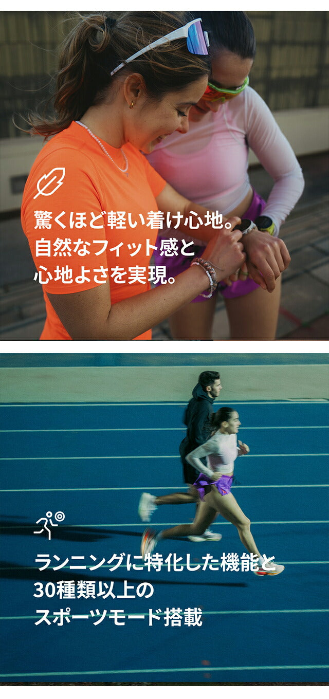 | 仕様 | 50m耐水 1.32インチAMOLEDハイレゾ(466×466)ディスプレイ リューズ デュアルバンドGPSシステム 34以上のスポーツモード GPSナビゲーション 血中酸素レベル トレーニングゾーン 心拍数変動 (HRV)の測定 タイムモード稼働時間:12日間 歩数計 距離計測 ルートナビゲーション カロリー 気圧計 温度計 気圧高度計 日の出/日の入り時刻表示 心拍、水中心拍 VO2max(最大酸素摂取量) ストレスレベル バイブレーション 通知機能 睡眠測定 ワークアウト数:34種類以上 |