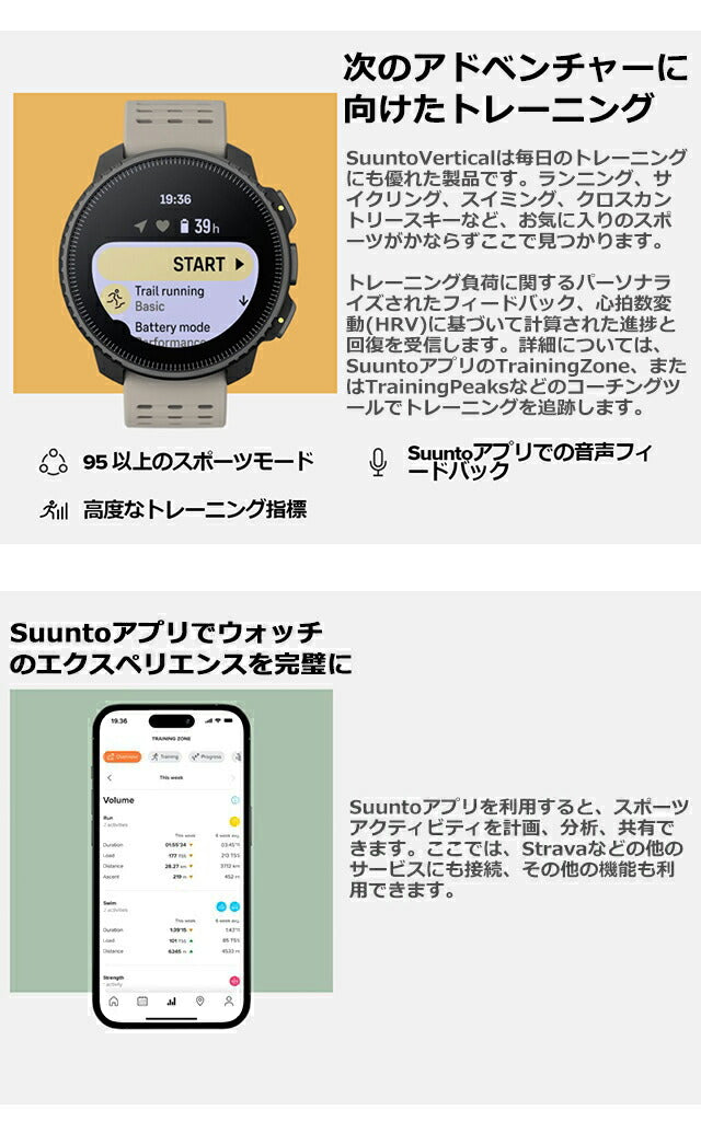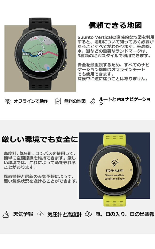 正規品 スント バーティカル Bluetooth メンズ レディース スマートウォッチ SUUNTO VERTICAL Solar デジタル 選べるモデル ◆Suunto(スント)は、フィンランドの冒険家トーマス・ヴォホロネン(Tuomas Vohlonen)によって80年以上前に創設されました。過酷な条件下での製品テストなど独自の水準を追及しています。 太陽光充電機能付きのアウトドア探検やトレーニング向けのアドベンチャーウォッチ。アクティブなライフスタイルのために役立つさまざまな機能が搭載されています。最大60日間のバッテリー持続時間。ランニング、サイクリング、ハイキングなど95種類以上のスポーツモードを搭載。血中酸素レベルや消費カロリー、睡眠を記録することができ、毎日の健康管理にも役立ちます。 SS050987000 SS050978000 SS050986000
