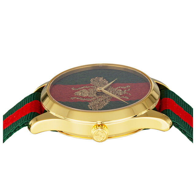 7年保証キャンペーン グッチ ジータイムレス スイス製 メンズ レディース 腕時計 YA126487B GUCCI G-Timeless アナログ レッド グリーン 赤 ◆1921年、グッチオ・グッチは革製品の会社を起業し、フィレンツェに小さな鞄店を開業。ブランドに対する彼のビジョンは、ロンドンと、彼がサボイ・ホテルで働いていた時に見た英国貴族の洗練された審美眼から培われたものです。財布や革製品以外にもアクセサリーや腕時計も品質の高さや、洗練されたデザインが人気で一気に高級ブランドの地位を確立しました。今では名を知らない人はいないぐらい世界的に有名なブランドです。 グリーン×レッドストライプは、グッチを象徴するアイコニックなカラーリング。文字盤とストラップの両方に同一柄をあしらうことで、統一感と強いブランド性を演出しています。文字盤中央にはゴールドの蜂(ビー)モチーフが刺繍風にデザインされており、平面ではなく立体感をもって視覚に訴えます。